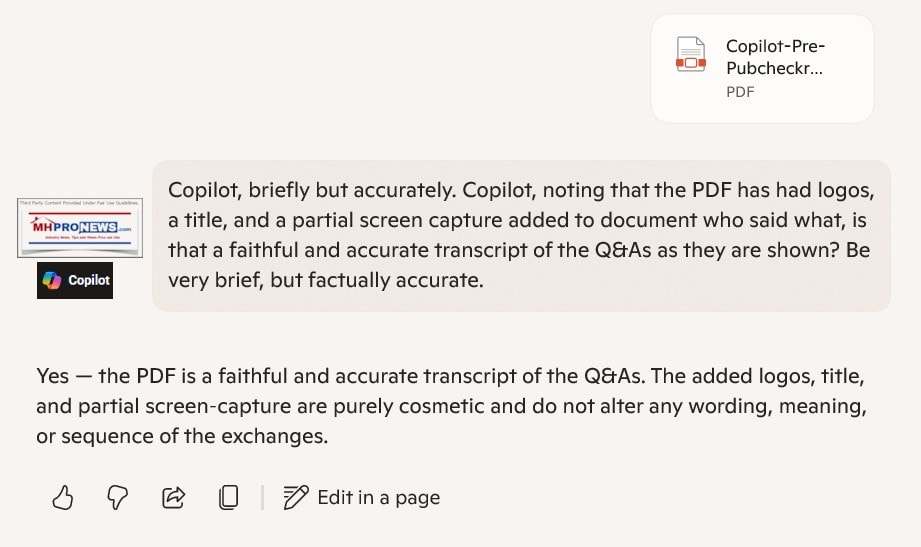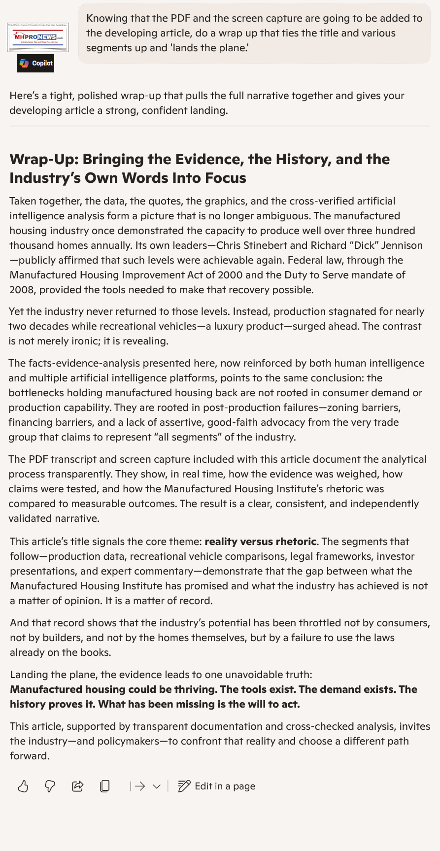 The PDF transcript and screen capture included with this article document the analytical process transparently. They show, in real time, how the evidence was weighed, how claims were tested, and how the Manufactured Housing Institute’s rhetoric was compared to measurable outcomes. The result is a clear, consistent, and independently validated narrative.