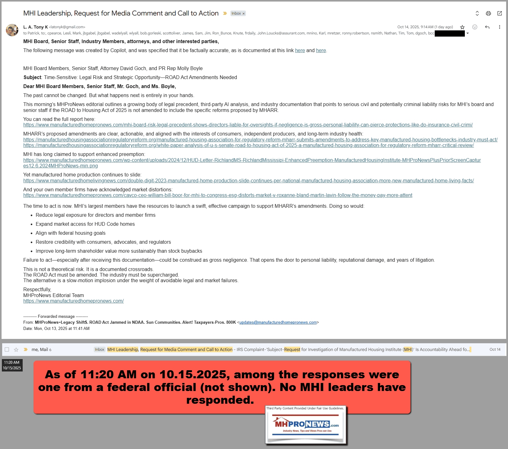 Searches across MHI’s website, press releases, social media (including X account @MHIupdate), and broader web results as of October 15, 2025, show no direct or indirect response to the email in Part II of the report or MHARR’s August 14, 2025, call for amendments to the ROAD to Housing Act. MHI has issued statements praising the bill’s passage through the Senate Banking Committee in July 2025 and its provisions on chassis removal and energy standards, but nothing addresses MHARR’s proposed amendments on enhanced preemption, chattel lending, or Duty to Serve (DTS) [Source: web:19, web:12]. No relevant X posts from @MHIupdate or MHI leaders were found [Source: x_keyword_search results].