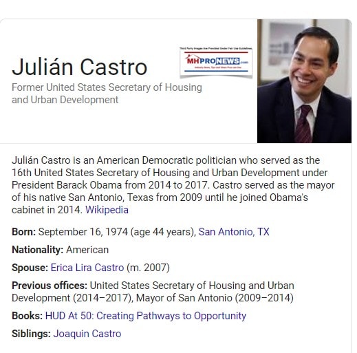 One of the points that makes this candidacy of interest to manufactured housing professionals is that Castro was former President Obama’s Secretary of Housing and Urban Development (HUD).