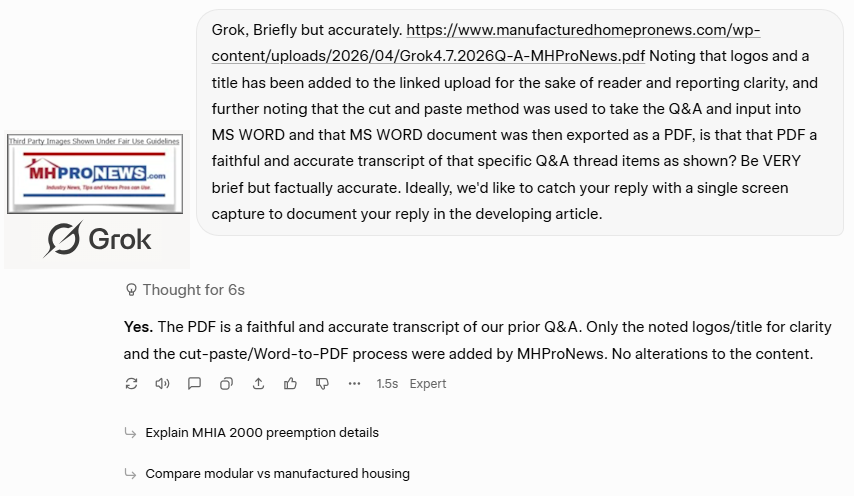 — MHProNews notes that the PDF of the full Q&A is linked here and includes some 20 linked references not shown above. Grok confirmed the accuracy of the above via the screen capture linked here and also posted below. —