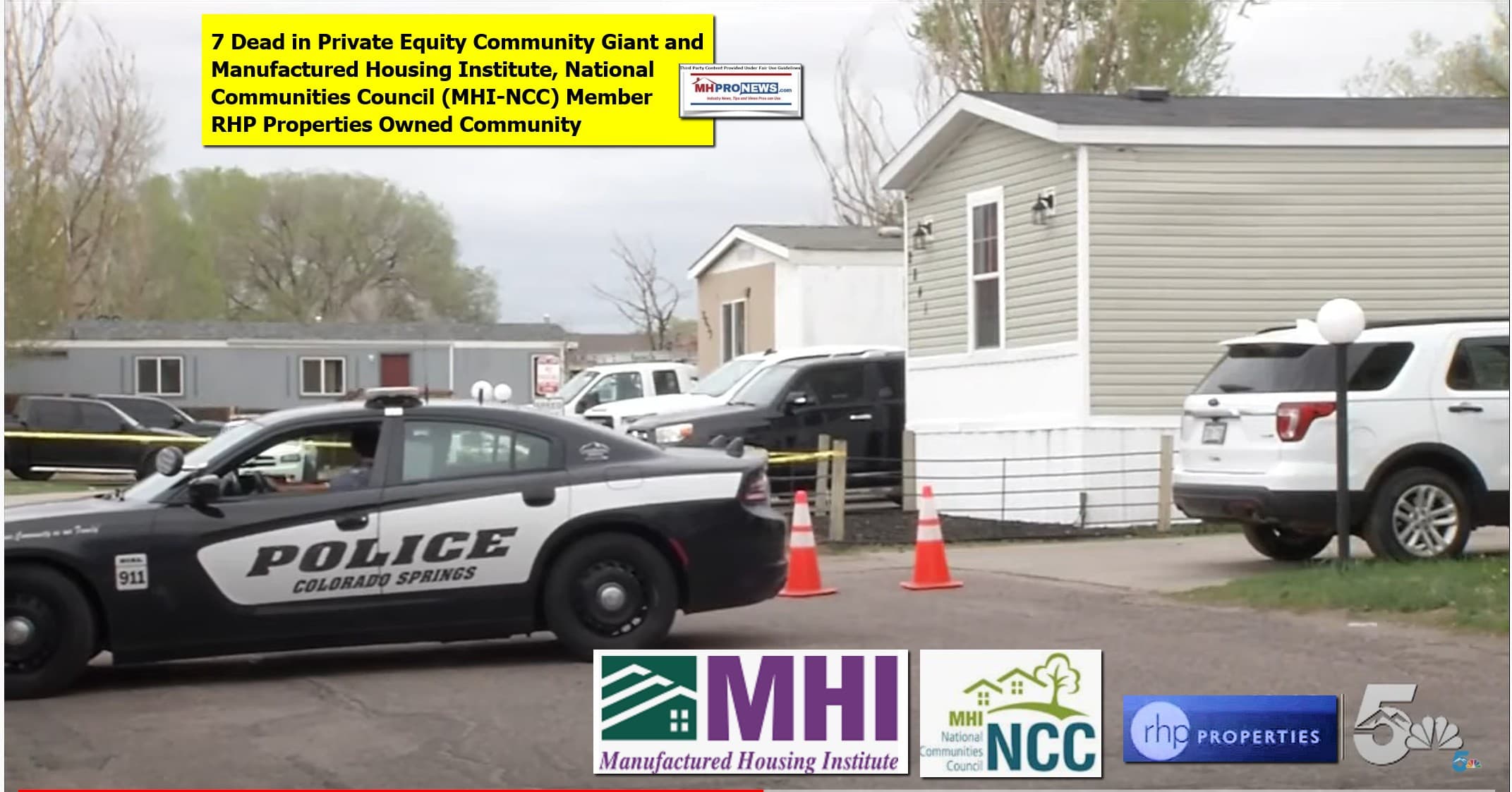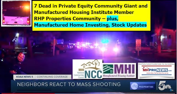 The KOAA News 5 YouTube video page says “7 people dead, including suspect, at birthday party in mobile home community…” The incident is still under investigation. “Colorado Springs Police confirm seven people are dead after a shooting at mobile home subdivision on the southeast side of the city.” It remains to be seen what connection, if any, the matter may have with the corporate owner of the property, RHP Properties.