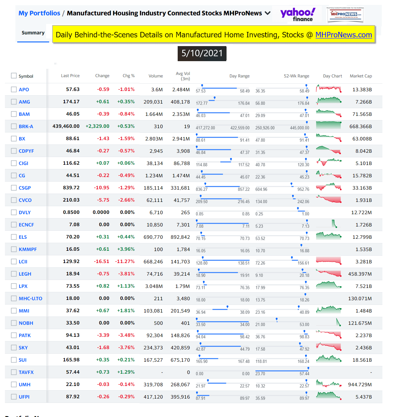 Manufactured Housing Industry Investments Connected Closing Equities Tickers