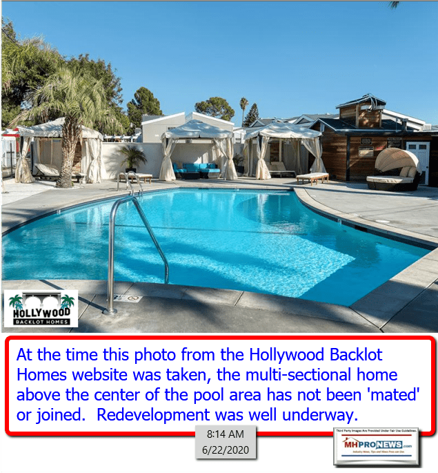 The Hollywood Backlot Homes website includes this ‘resident’ statement, “New units are very modern. Old established units are in the back. Close to freeway. – Jonathan Aguirre, 2/24/2018.” That also indicates that the project is well underway, as opposed to being a new redevelopment project.