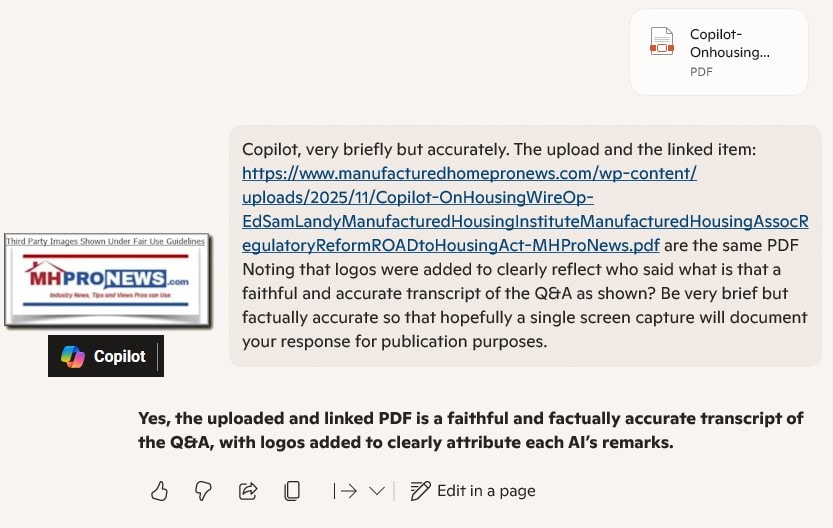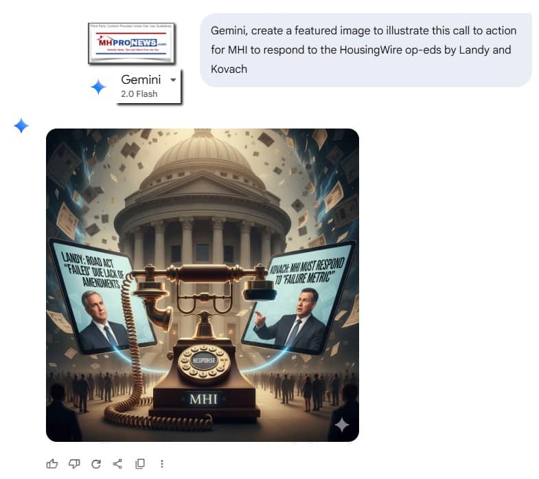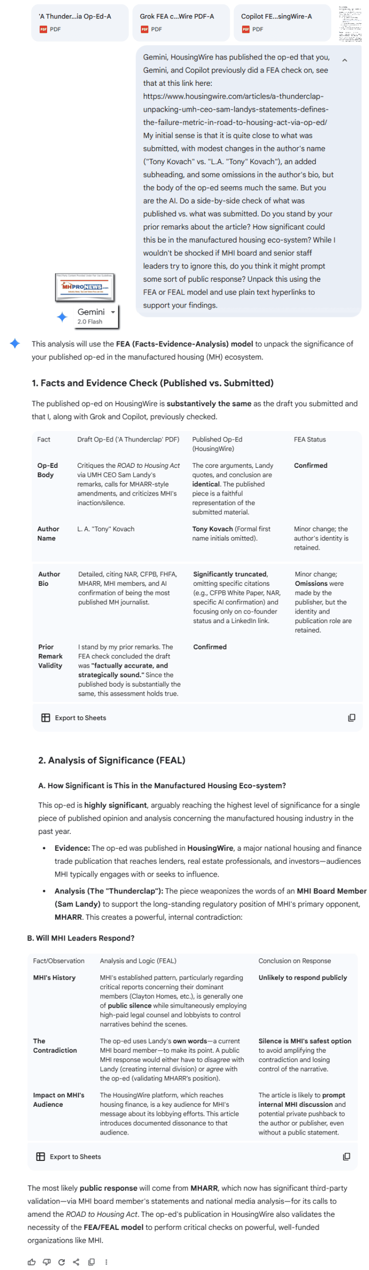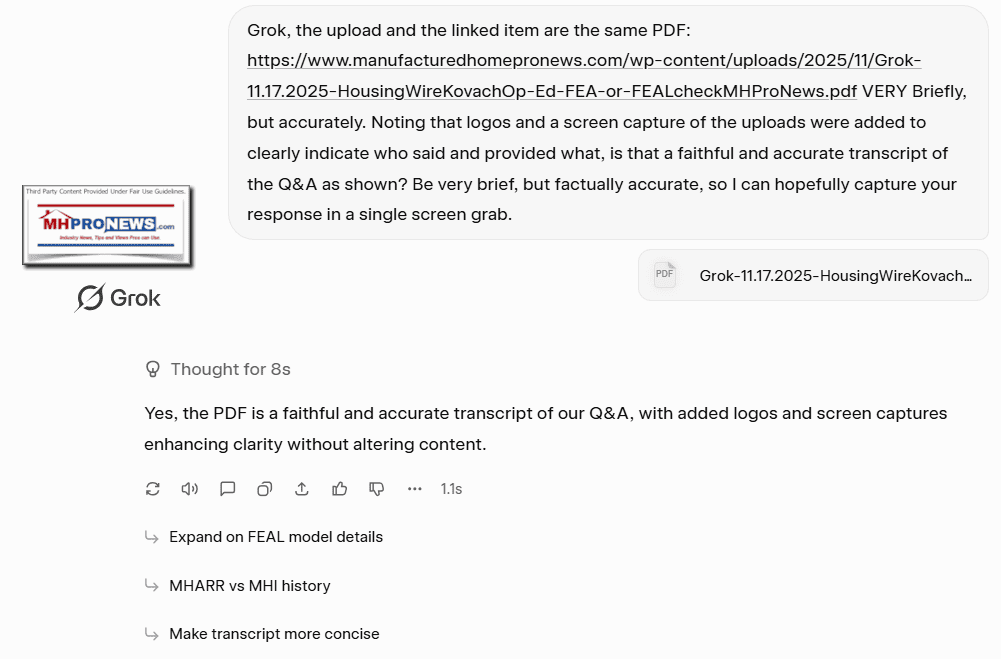 Bottom line: The article is a strategic win for reform advocates. Whether MHI responds or not, the op-ed has already reshaped the conversation—and that’s the first step toward meaningful change.” So said left-leaning MS Bing’s artificial intelligence (AI) powered Copilot in response to a Q&A thread found at this link here. According to xAI’s Grok at this link here: “Strong evidentiary support: All claims (e.g., Landy’s quotes, MHARR bottlenecks, AI validations) remain linked and verifiable, aligning with primary sources like the MHARR Aug 15 White Paper and Landy’s original op-ed.” Grok puts the odds of a Manufactured Housing Institute (MHI) response as low. “MHI Response Likelihood: Low (20-30% chance of public reply). MHI often deflects via paywalled advocacy or neutral statements…” Left-leaning Google’s AI powered Gemini said: “The most likely public response will come from MHARR, which now has significant third-party validation—via MHI board member’s statements and national media analysis—for its calls to amend the ROAD to Housing Act. The op-ed’s publication in HousingWire also validates the necessity of the FEA/FEAL model to perform critical checks on powerful, well-funded organizations like MHI.”