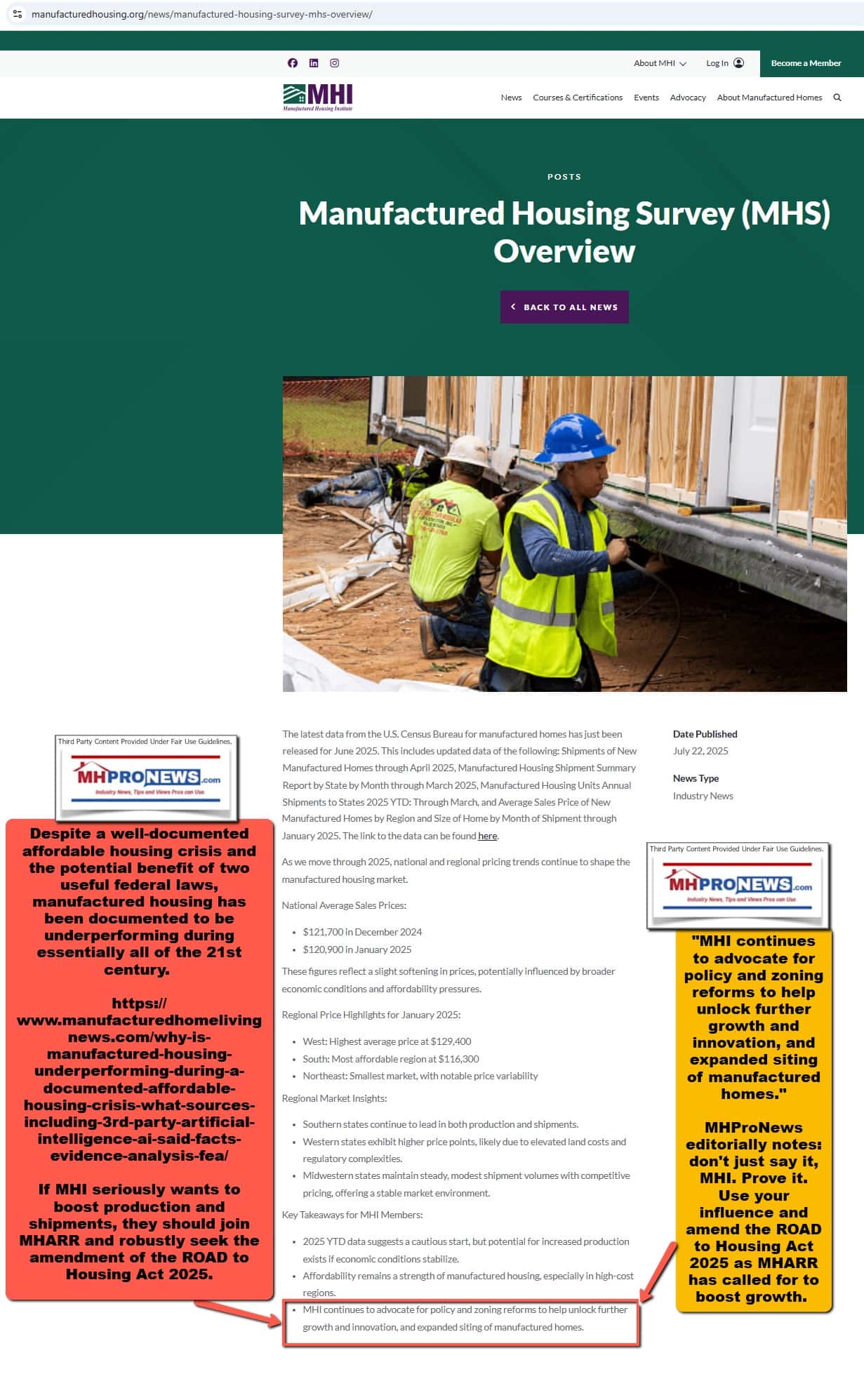 MHProNews hereby encourages and challenges MHI leaders to publicly respond through the clear evidence and multiple third-party supported analyses which all backed the need to act to fix the ROAD to Housing Act 2025 while time remains to do so.  MHI claimed on 7.22.2025 that: “MHI continues to advocate for policy and zoning reforms to help unlock further growth and innovation and expanded siting of manufactured homes.” If so, then MHI should join with MHARR and amend or kill the ROAD to Housing Act 2025 bill, as the Masthead advocated weeks ago.