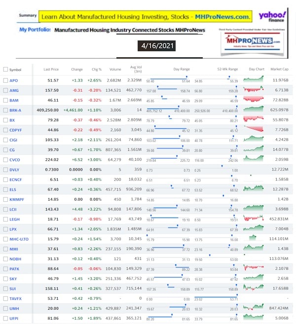 Manufactured Housing Industry Investments Connected Closing Equities Tickers