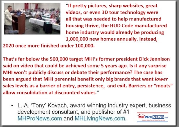 Those critics of MHI include serious voices from within the manufactured home industry’s ranks. Beyond Lavin or MHARR, the reports linked below and herein each routinely state specific misses by MHI.
