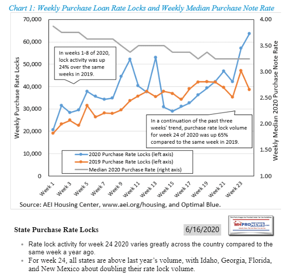 In a continuation of the last three weeks’ strong upward trend, purchase rate lock volume for the week of June 6 (week 24) jumped 65% from a year ago. This provides further evidence that the worst of the near term effects of the COVID-19 pandemic lockdown may be behind us on a national level.