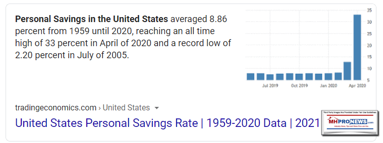 TradingEconomics put it this way. “Personal Savings in the United States averaged 8.86 percent from 1959 until 2020, reaching an all time high of 33 percent in April of 2020 and a record low of 2.20 percent in July of 2005.”