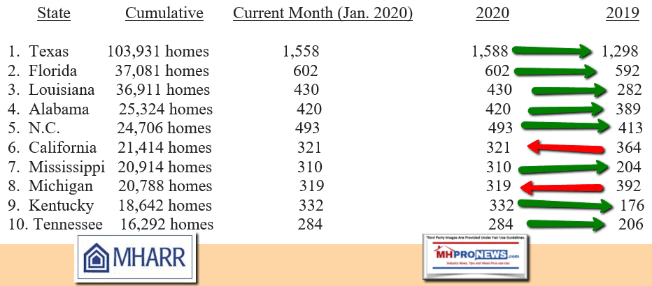 January’s 2020 production numbers are in from the Washington, D.C. based Manufactured Housing Association for Regulatory Reform (MHARR). Following their data, we’ll do a simple and clear fact check. Note that the arrows below are from MHProNews.