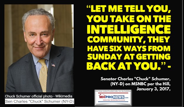 “Let me tell you, you take on the intelligence community, they have six ways from Sunday at getting back at you.” Senator Charles “Chuck” Schumer, (NY-D) on MSNBC per the Hill, January 3, 2017,