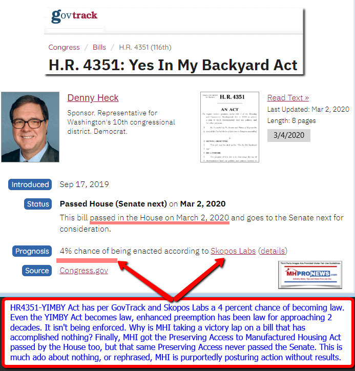 Rephrased, MHARR said that they don’t expect this law to do much, even if it does pass. Why? Because enhanced preemption is already law and it is being ignored. MHI pays lip service to the law, but as numerous prior reports have made plain, they have apparently failed to press the matter with officials at HUD. It was so insignficant, that MHARR didn’t bother mention it to their members. Why get lathered up about nothing? See what third-party GovTrack and Skopos Labs had to say about the bill on the same date as MHI was patting themselves on their own backs.