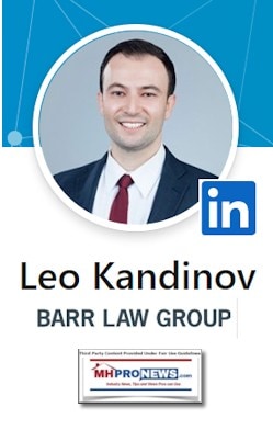 From the Barr Law Group website is the following information about Partner Leo Kandinov. The photo and Barr logo were added by MHProNews from Kandinov’s LinkedIn profile.