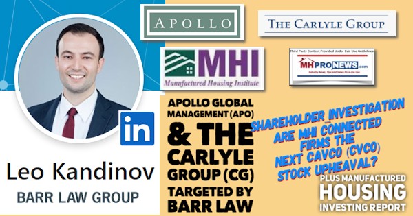 The Globe Newswire and Yahoo Finance on 4.27.2021 are the sources for the following segments of two different press releases that name The Carlyle Group Inc and Apollo Global Management, Inc., among others in a legal probe on behalf of shareholders. The Carlyle Group Inc (NASDAQ:CG) and Apollo Global Management, Inc. (NYSE:APO) each have reported ties to the seemingly periodic eruptions of scandals that have plagued several of the members of the Manufactured Housing Institute (MHI) and its National Communities Council (NCC) for some years. While other publicly traded firms are also named in these legal probes by the Barr Law Group, those parts have been omitted in this report as having less direct relevance to manufactured housing industry professionals and investors.