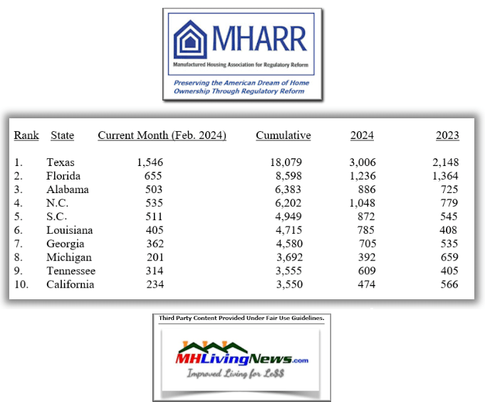 The Institute for Building Technology & Safety (IBTS) operates under a contract with the U.S. Department of Housing and Urban Development (HUD) to collect new HUD Code manufactured housing data for the federal agency. Per their website: “IBTS is the single source for manufactured home data used to identify whether a home was built according to the HUD Manufactured Home Construction and Safety Standards (HUD code) and, if so, how it was designed and constructed.” Using official HUD data, the Manufactured Housing Association for Regulatory Reform (MHARR) provides the single largest known publicly available collection of U.S. HUD Code manufactured housing data at this link here. In stark contrast to Washington, D.C. based MHARR, to the National Association of Realtors (NAR), the Recreational Vehicle Industry Association (RVIA), and the National Association of Home Builders (NAHB), the Arlington, VA based Manufactured Housing Institute (MHI) for some years have limited monthly manufactured home production reports to members only. MHI has also apparently limited other industry information once previously made available to the public. With that in mind, this report is one of the few that makes available to thousands of industry professionals, as well as to others peering into the intricacies and oddities of the manufactured housing industry, information that reflects the health of the industry as measured by production, factual, and thus authentic (vs. faux, paltering or posturing) industry trends. The data that follows is for new HUD Code manufactured home “Shipments and Production Summary Report 2/01/2024 – 2/29/2024.” The breakdown is by state.