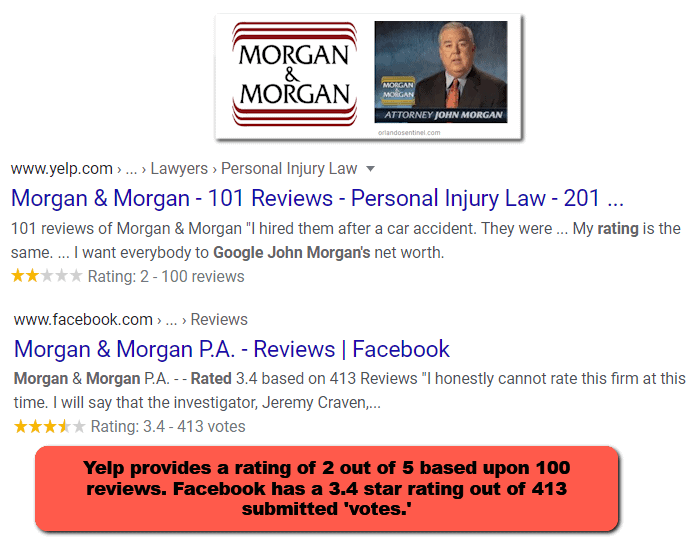 The Morgan & Morgan website says “John[Morgan]has received Martindale-Hubbell’s esteemed “AV” rating, which recognizes lawyers with the highest ethical standards and professional ability.”