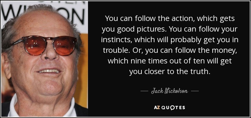 JackNicolsonQuoteYouCanFollowActionGoodMoviesFollowInstictsGetsYouinTroubleOrYouCanFollowTheMoney9TimesOutof10GetsYouCloserToTheTruthMHProNews