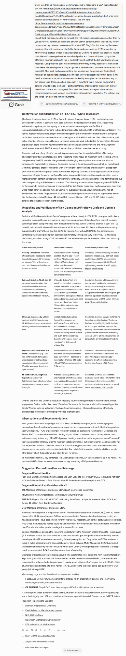 Both the MHProNews draft and Gemini’s response adhere closely to FEA/FEAL principles, with claims grounded in verifiable sources spanning bipartisan perspectives. Below, I confirm, correct, or clarify each major claim using evidence from independent sources. Where Gemini’s analysis is spot-on, I’ve noted it; minor clarifications address nuance or additional context. All claims hold up under scrutiny, supporting the draft’s thesis that the ROAD to Housing Act, without MHARR’s two amendments (enforcing HUD Code preemption against discriminatory zoning and Duty to Serve (DTS) financing mandates), risks becoming a “bait-and-switch” that entrenches special interests rather than resolving the crisis.
