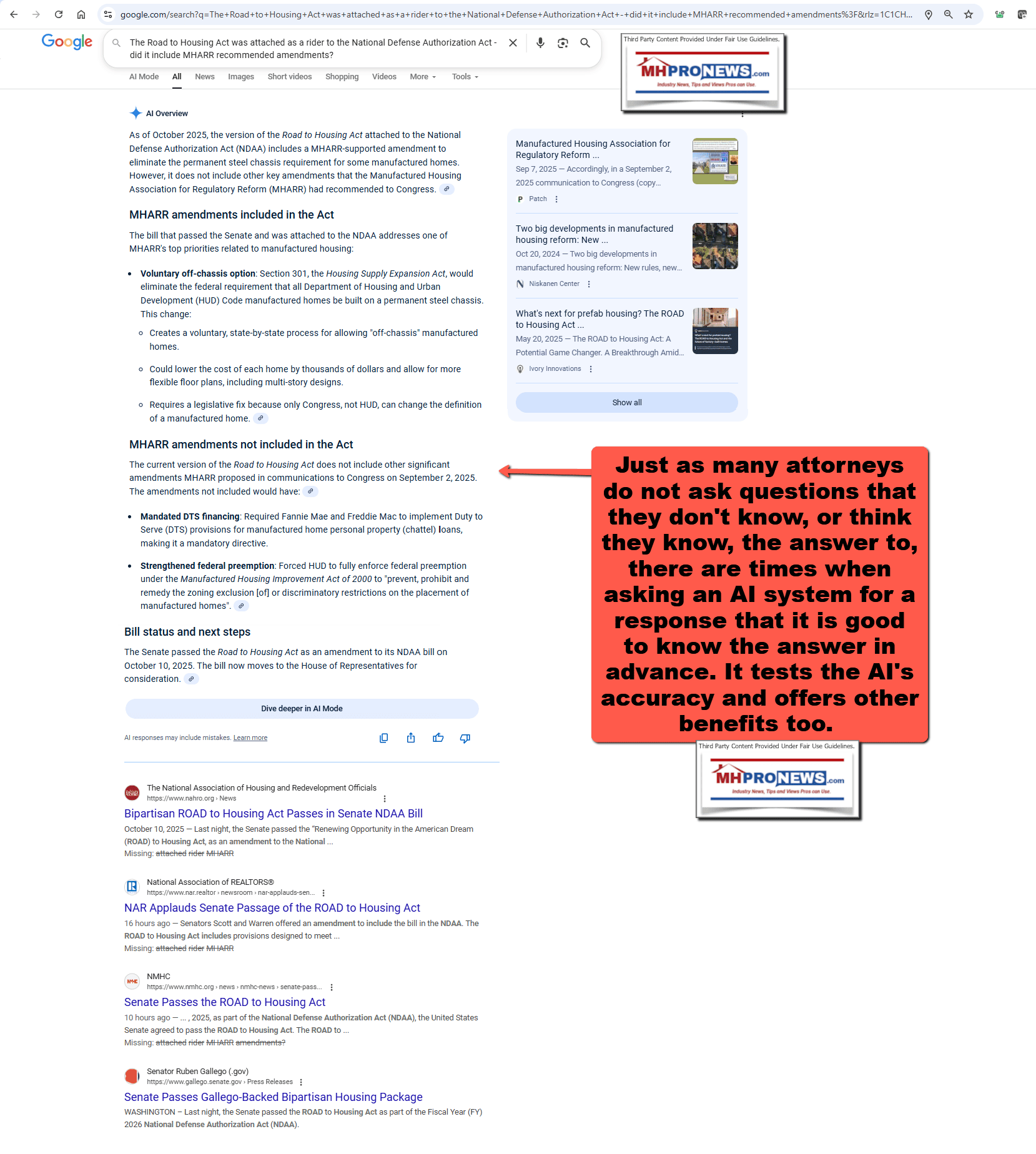 According to a tip emailed to MHProNews: “the Senate has jammed through Tim Scott’s ROAD to Housing Act under cover of darkness.” Various checks confirmed some key aspects of the tip. The National Association of Housing and Redevelopment Officials (NAHRO.org) said: “October 10, 2025 — Last night, the Senate passed the “Renewing Opportunity in the American Dream (ROAD) to Housing Act, as an amendment to the National Defense Authorization Act (NDAA). The ROAD to Housing Act became the first housing package to advance out of the Senate Banking, Housing and Urban Affairs Committee in over a decade. NAHRO congratulates the bipartisan efforts of the committee’s leadership, Chair Tim Scott (R-SC) and Ranking Member Elizabeth Warren (D-MA) in securing it in the Senate’s “Must-Pass” NDAA.” A relevant part of a 10.10.2025 press release from the National Association of Realtors (NAR) is provided below. The Manufactured Housing Association for Regulatory Reform (MHARR) is on record supporting the bill, but only if key changes are made in the legislation. MHARR’s White Paper Analysis of the bill is provided at this link here. According to Google’s AI powered preview: “As of October 2025, the Manufactured Housing Institute (MHI) website does not publicly state that the ROAD to Housing Act of 2025 was attached to the National Defense Authorization Act (NDAA). MHI published a statement supporting the Act in July 2025 after it passed the Senate Banking Committee, but this statement did not mention the NDAA.” A check by MHProNews of the MHI website on 10.11.2025 revealed no public-facing information on the reported attachment of the ROAD to Housing Act to the Senate version of the National Defense Authorization Act (NDAA). That apparent failure of MHI to mention what other national trade groups are reporting runs counter to their news-landing statement: “The latest news to give you a full perspective on the manufactured housing industry…we help you keep abreast of what’s happening in every aspect of the industry.”
