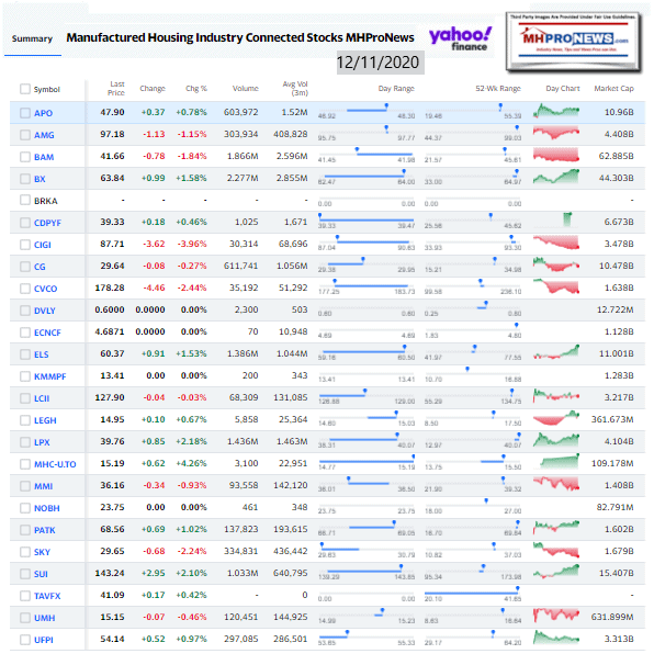 Manufactured Housing Industry Investments Connected Closing Equities Tickers