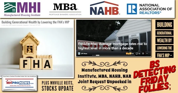 Expect at some point in the near term for the Manufactured Housing Institute (MHI) to issue a communique patting their own backs for having yet another ‘housing coalition partners’ letter that has been issued to the Biden Administration. There are already some headlines on the issue that the brought MHI, the National Association of Home Builders (NAHB), the National Association of Realtors (NAR), and the Mortgage Bankers Association (MBA) together. For those who have, or are in the process of earning, their mainstream media and/or MHI BS decoder rings from MHProNews, the following clues may not be necessary. For all other readers? Hang onto your hats. MHI, NAR, NAHB, and the MBA have issued a letter to Biden Administration officials – quoting the MReport version of a mainstream news report for this periodic Friday Follies installment – “Building Generational Wealth by Lowering the FHA’s MIP.” Wow! What a win for NAR, NAHB, and the MBA to have MHI on board with that hot topic!