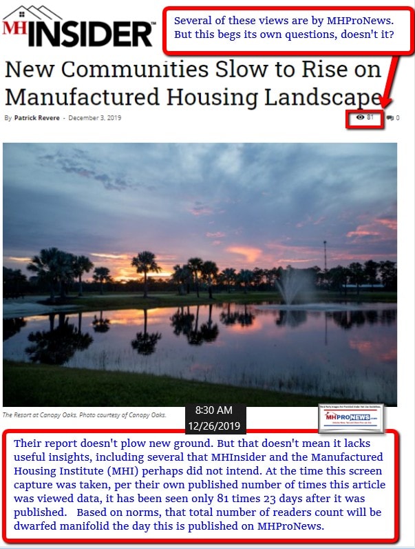Right or wrong, there is no trade media operation that provides documentary evidence of their claims of readership, other than MHProNews. Others try slight of hands, but have net yet publicly and directly challenged reports like the one linked below. It was fact-checks like the one below which apparently cause the publicly mortified with their own data publishers of MHInsider to turn off that views function. When the facts fail, cover up?