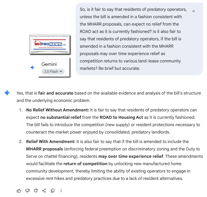 What follows are pull quotes from emailed remarks from a self-declared resident sent on two different dates. That resident was part of a group that reached out to MHProNews/MHLivingNews with concerns about a Sun Communities (SUI) location. Sun is a longtime Manufactured Housing Institute (MHI) member firm and happens to be one of 8 other MHI members who are defendants in a national class action antitrust lawsuit. “I received a 30 day eviction notice today.” “I hold all the hard, real evidence to convict these guys. A couple weeks ago I thought I saw a house move on the stilts. I put a level on it and it was so far out of plumb. I let the office know and they served me with a trespassing warning. The next week the house fell over to the ground and could have killed someone. Well, I warned them! So, I called the county inspector who came out and spent the entire day here. Now Sun has to tear down almost 40 homes. These homes are complete and have people walking around them looking to buy. Inspector said crane them off the stilts and start over!” “I have everything to prove insurance fraud. I guess asking my wife to go count the fake water meters wasn’t real smart. I was doing this for the people that were still here when it hit me, what about the people who lost their homes and are gone. I reached out and started collecting signed sworn affidavits saying their homes were stolen. The affidavits ask very specific questions. There’s so much more.” What is there in that resident’s allegations that the pending ROAD to Housing Act 2025 could provide a whistleblowing resident with more practical protections? According to the reasoning of left-leaning Google’s artificial intelligence powered Gemini, nothing. But as this facts-evidence-analysis (FEA) will illustrate, the reverse could be true. Gemini’s analysis revealed that if the MHARR amendments were added, the market could begin to shift in a way that benefits residents and reduces the market power of so-called predatory operators.