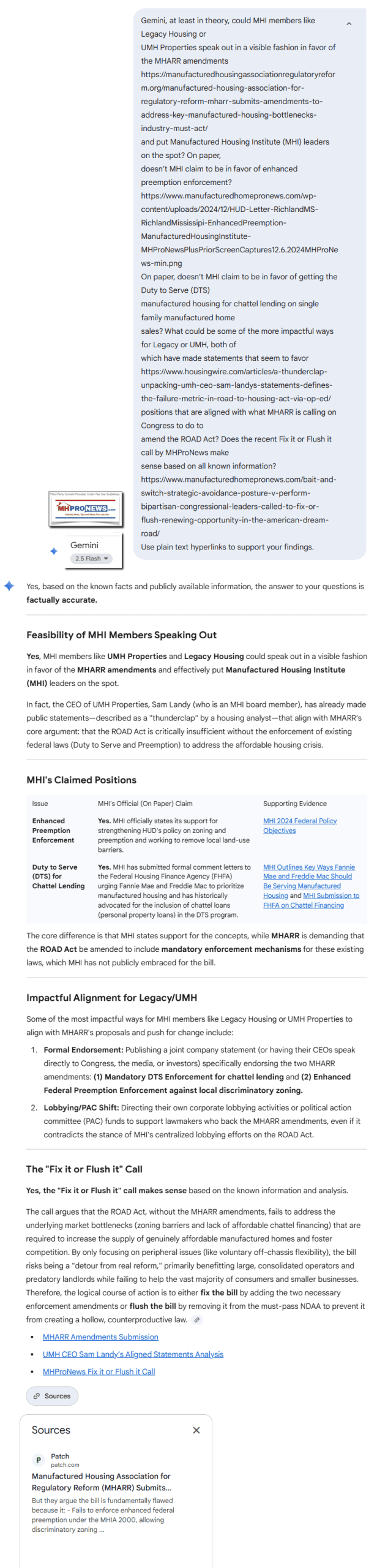 Gemini, at least in theory, could MHI members like Legacy Housing or UMH Properties speak out in a visible fashion in favor of the MHARR amendments https://manufacturedhousingassociationregulatoryreform.org/manufactured-housing-association-for-regulatory-reform-mharr-submits-amendments-to-address-key-manufactured-housing-bottlenecks-industry-must-act/ and put Manufactured Housing Institute (MHI) leaders on the spot? On paper, doesn’t MHI claim to be in favor of enhanced preemption enforcement? https://www.manufacturedhomepronews.com/wp-content/uploads/2024/12/HUD-Letter-RichlandMS-RichlandMississipi-EnhancedPreemption-ManufacturedHousingInstitute-MHProNewsPlusPriorScreenCaptures12.6.2024MHProNews-min.png On paper, doesn’t MHI claim to be in favor of getting the Duty to Serve (DTS) manufactured housing for chattel lending on single family manufactured home sales? What could be some of the more impactful ways for Legacy or UMH, both of which have made statements that seem to favor https://www.housingwire.com/articles/a-thunderclap-unpacking-umh-ceo-sam-landys-statements-defines-the-failure-metric-in-road-to-housing-act-via-op-ed/ positions that are aligned with what MHARR is calling on Congress to do to amend the ROAD Act? Does the recent Fix it or Flush it call by MHProNews make sense based on all known information? https://www.manufacturedhomepronews.com/bait-and-switch-strategic-avoidance-posture-v-perform-bipartisan-congressional-leaders-called-to-fix-or-flush-renewing-opportunity-in-the-american-dream-road/ Use plain text hyperlinks to support your findings.