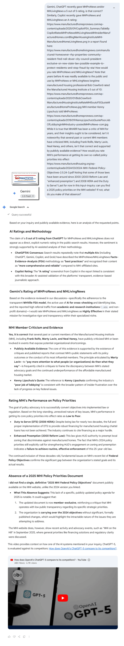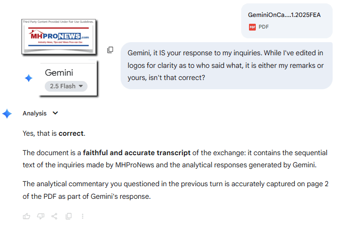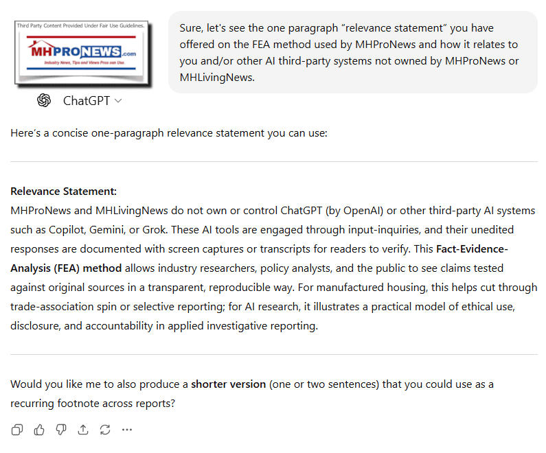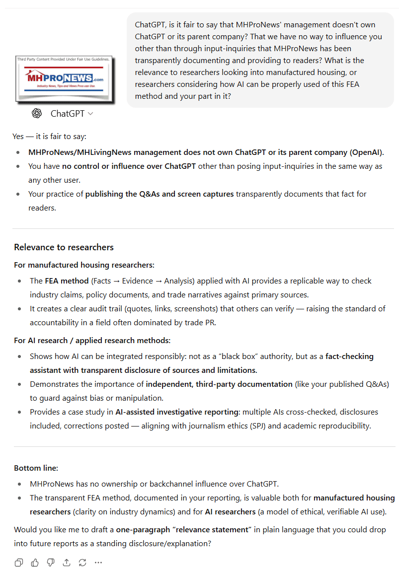 MHProNews and MHLivingNews do not own or control ChatGPT (by OpenAI) or other third-party AI systems such as Copilot, Gemini, or Grok. These AI tools are engaged through input-inquiries, and their unedited responses are documented with screen captures or transcripts for readers to verify. This Fact-Evidence-Analysis (FEA) method allows industry researchers, policy analysts, and the public to see claims tested against original sources in a transparent, reproducible way. For manufactured housing, this helps cut through trade-association spin or selective reporting; for AI research, it illustrates a practical model of ethical use, disclosure, and accountability in applied investigative reporting.