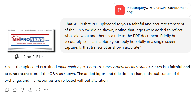 1) With respect to the relationship between the management of MHProNews and third-party AI and how it is used in reports like this one. Here is how ChatGPT described that yesterday (10.1.2025) in response to the input-inquiry (question, discussion, chat, etc.) with MHProNews while ‘logged in’ as shown.