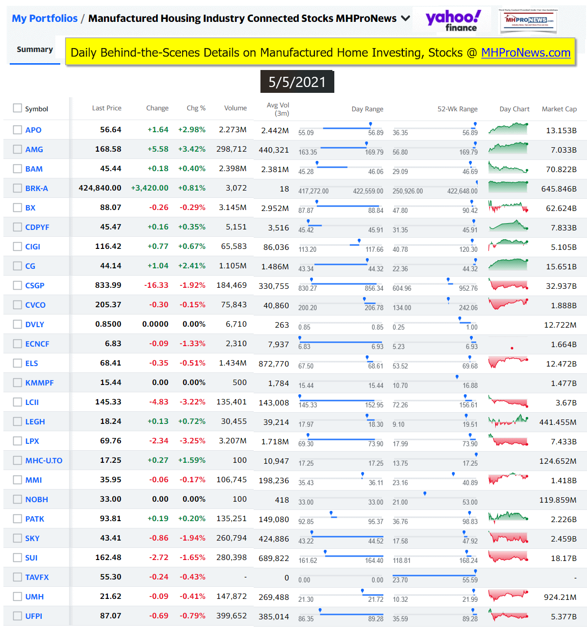 Manufactured Housing Industry Investments Connected Closing Equities Tickers