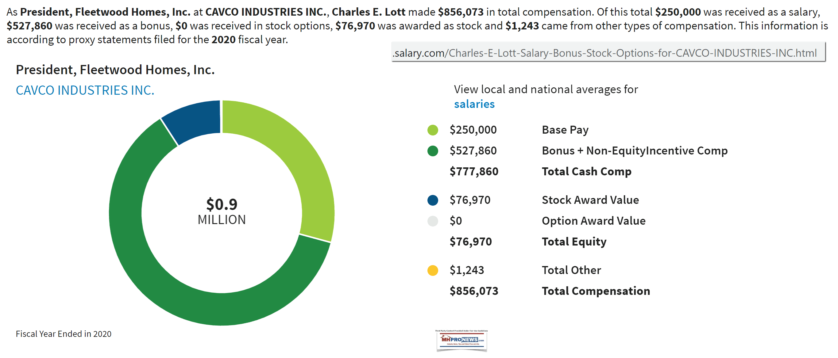“As President, Fleetwood Homes, Inc. at CAVCO INDUSTRIES INC., Charles E. Lott made $856,073 in total compensation,” said Salary. “Of this total $250,000 was received as a salary, $527,860 was received as a bonus, $0 was received in stock options, $76,970 was awarded as stock and $1,243 came from other types of compensation. This information is according to proxy statements filed for the 2020 fiscal year.”
