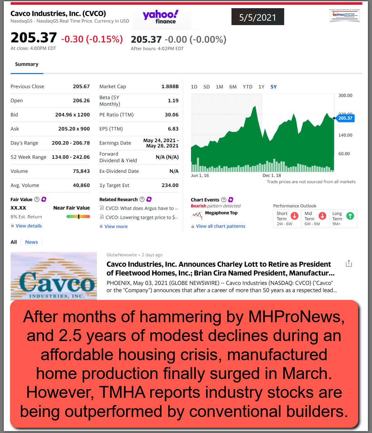 Fast forward With those background elements not found in the press release below, now fast forward to May 3, 2021. The following is per once higher-flying Cavco Industries.