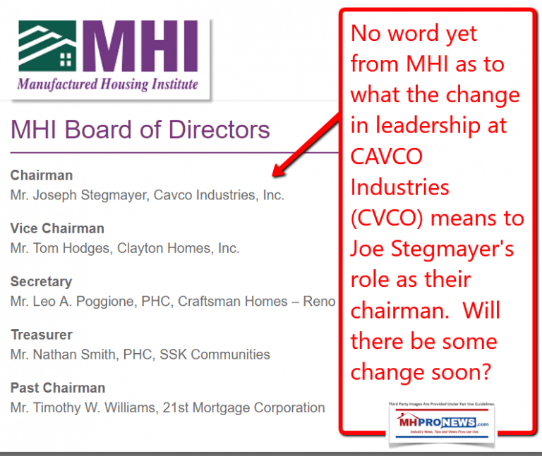 Last and not least. Sources inside Cavco told MHProNews that despite the notion that Stegmayer ‘stepped down’ as chair and CEO, he continued to carry an oversized role in the firm. Additionally, the Manufactured Housing Institute (MHI) continued to have Stegmayer function as their chairman of the board, despite the public scandal and stock crash following the SEC subpoena. MHProNews contacted Cavco’s outside media relations person. They have not as of press time confirmed or denied the concerns raised in this report.