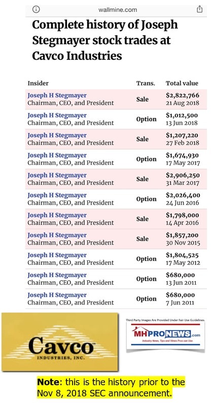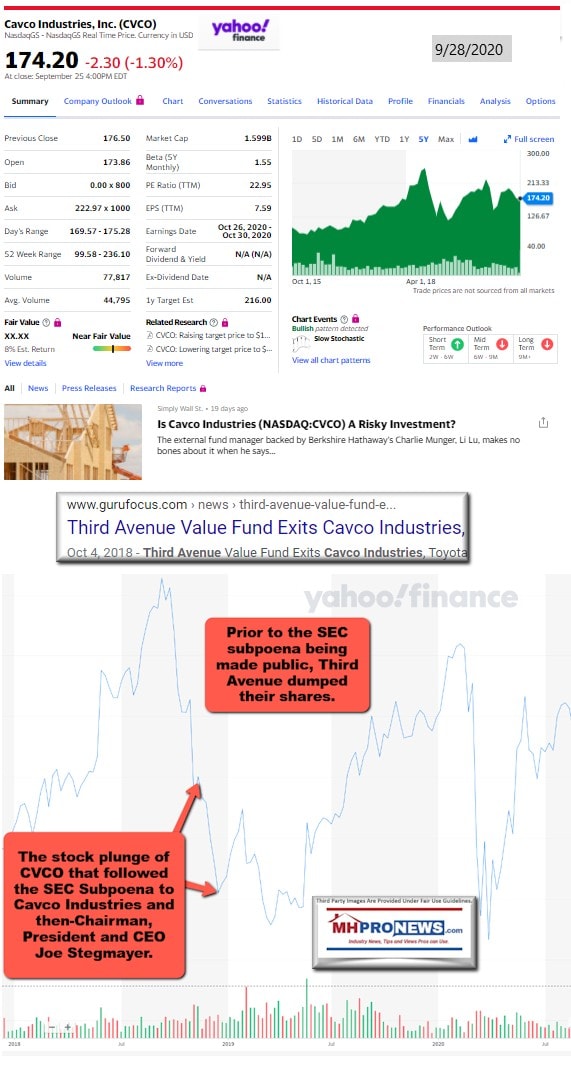 Newcomers to MHProNews may need an FYI that it was in November, 2018 that Cavco’s stock dropped sharply as a result of the news that prior Chairman, President, and CEO Joe Stegmayer – as well as Cavco – were issued a subpoena over securities related controversies that allegedly violated SEC regulations.