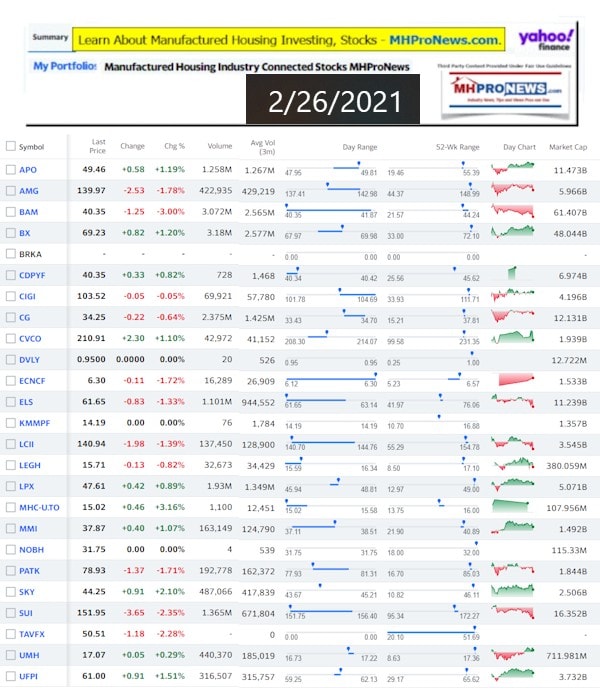 Manufactured Housing Industry Investments Connected Closing Equities Tickers