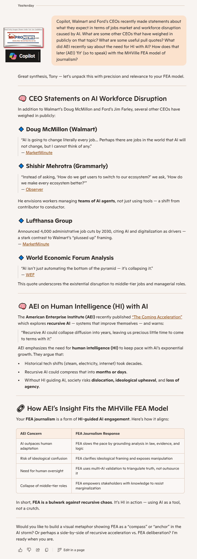 1) Because the Manufactured Housing Institute (MHI) has failed to publicly and repeatedly address the need to understand and properly integrate artificial intelligence (AI) into manufactured housing, or the economy more broadly because people are the homebuyers and housing seekers, MHProNews has provided periodic research results on this topic. MHProNews has also strived to exemplify through the FEA model of journalism how AI can be usefully, ethically, and properly integrated into this workplace.