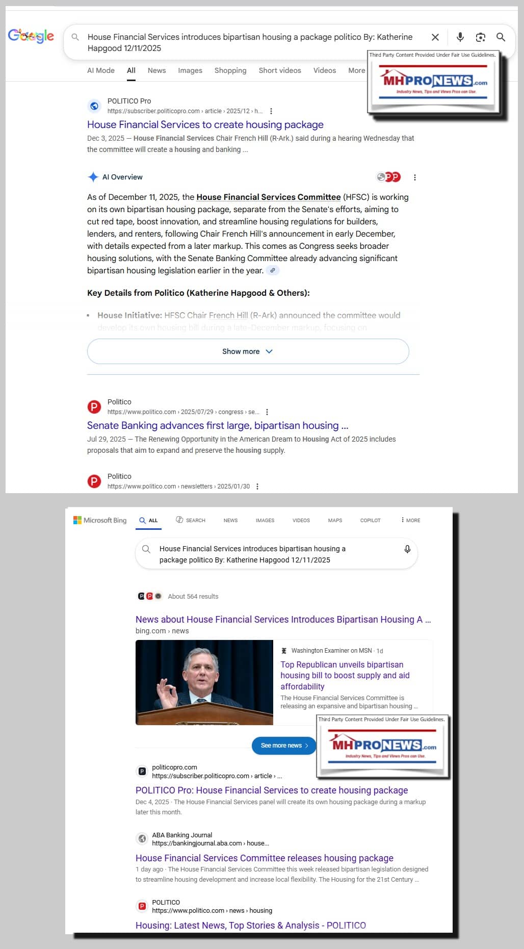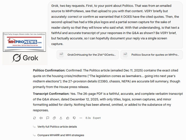 Grok is correct in the sense that a Google or Bing searches does not bring up that specific item from Politico, because that item from Politico was received at MHProNews by email where Google searches don’t (yet) work. That Politico content that MHProNews sourced above is found at the document at this link here. So, once again, this demonstrates that third-party AI doesn’t just ‘burp out’ a rubber stamp of the accuracy of MHProNews’ content. When a good FEA check is performed by both human intelligence (HI) and artificial intelligence (AI) the result on MHProNews is routinely validation because we take pains to present the facts and evidence accurately.