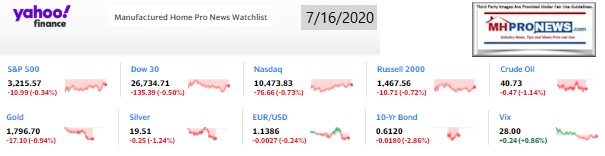 With that backdrop, following the left-right bullet headlines tonight from CNN and Fox, some quotable quotes, and two of our three market summaries at the closing bell is our featured focus this evening. The manufactured housing specific stocks and those firms with significant interests in manufactured homes and communities follows the featured focus, the recent and related reports, near the end of this business-nightly report.
