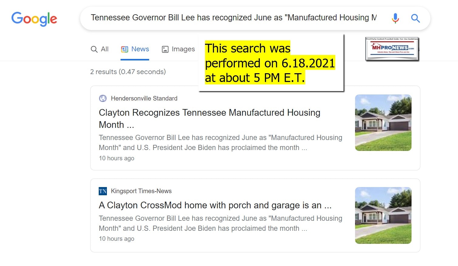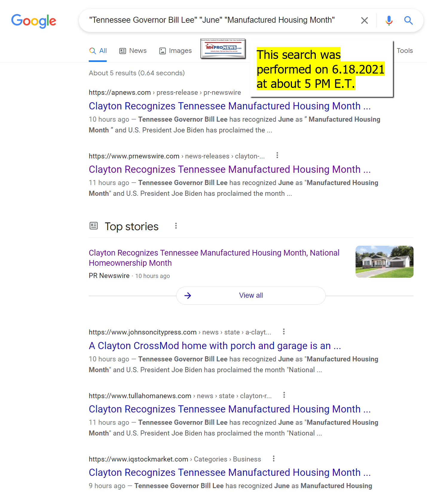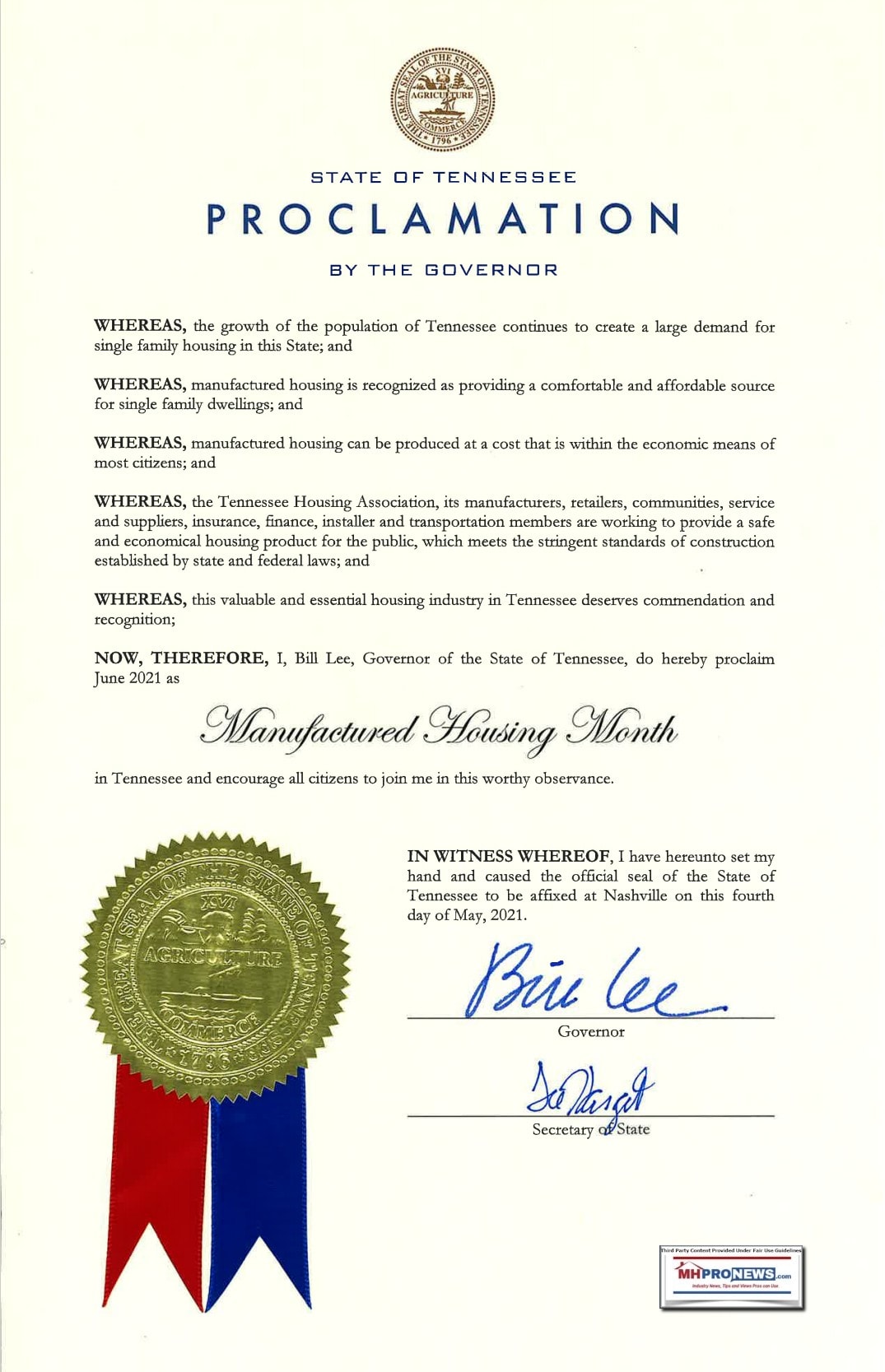 A tip from the Tennessee Manufactured Housing Association (TnMHA or Tennessee Housing Association) advised MHProNews that the proclamation by TN Gov. Bill Lee was officially signed on May 4, 2021. That means that Clayton Homes, a TnMHA member, knew weeks ago about this proclamation.