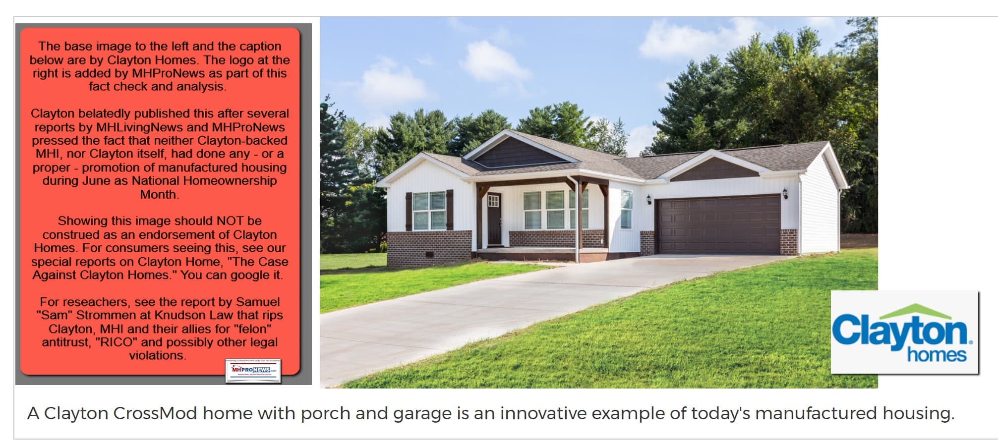 Additionally, instead of showing a mainstream HUD Code manufactured home, the kind that Kevin Clayton praised in testimony to Congress in the report linked below, the photo shown was of a Clayton-backed, MHI branded CrossModTM home. As detail minded MHProNews readers may recall, It was following the MHI-Clayton push for that “new class of manufactured homes” later rebranded as CrossModTM homes that manufactured housing went into a 2½ year downturn.