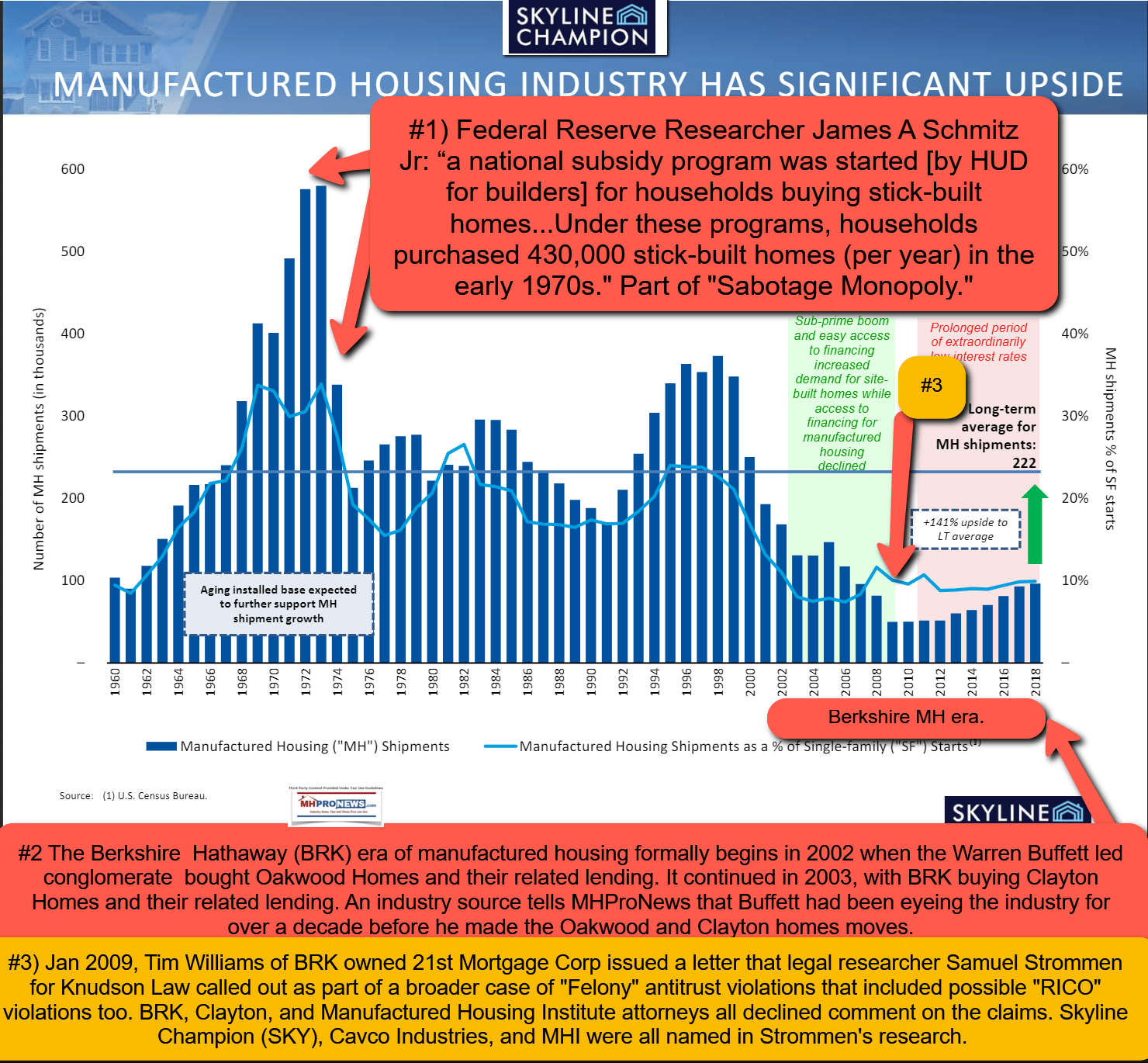 To learn more, see the reports linked herein. Because whatever one might think of Schmergel and Rolfe’s respective missives, one thing is clear. The HUD Code industry – despite years of posturing and claims by Kevin Clayton, CEO of Berkshire Hathaway (BRK) owned Clayton Homes, which demonstrably has serious influence over MHI, the industry stands at a lower level today than in 2002-2003 when Warren Buffett led his conglomerate’s slow-motion invasion of the manufactured housing industry.