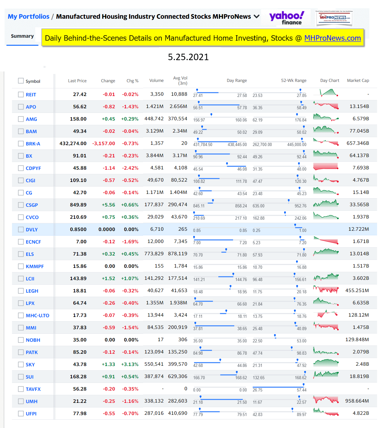 Manufactured Housing Industry Investments Connected Closing Equities Tickers