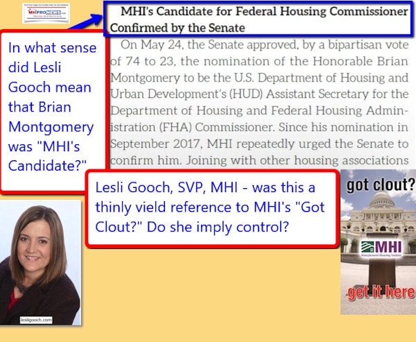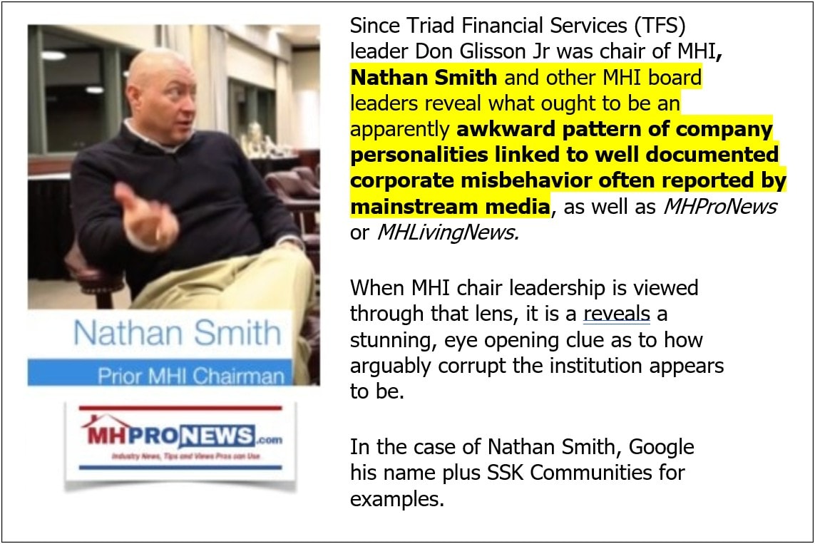 Note to newcomers, the term ‘the industry’ is often used as a kind of code-words for the Manufactured Housing Institute (MHI). An example of that is reflected in the comment linked here by Nathan Smith, a prior MHI chairman. Thus that attempted conflation of the term of “the industry” with MHI may be due to the fact that MHI leaders push that notion. As they state it on their own website, “The Manufactured Housing Institute is the only national trade organization representing all segments of the factory-built housing industry.” At other times, they say “all segments of the manufactured housing industry.” The Arlington, VA based trade group routinely adds that “MHI members include home builders, retailers, community operators, lenders, suppliers and affiliated state organizations.”