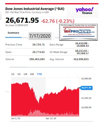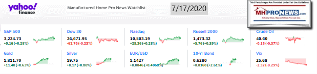 With that backdrop, following the left-right bullet headlines tonight from CNN and Fox, some quotable quotes, and two of our three market summaries at the closing bell is our featured focus this evening. The manufactured housing specific stocks and those firms with significant interests in manufactured homes and communities follows the featured focus, the recent and related reports, near the end of this business-nightly report.