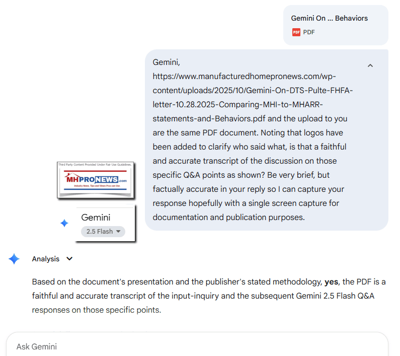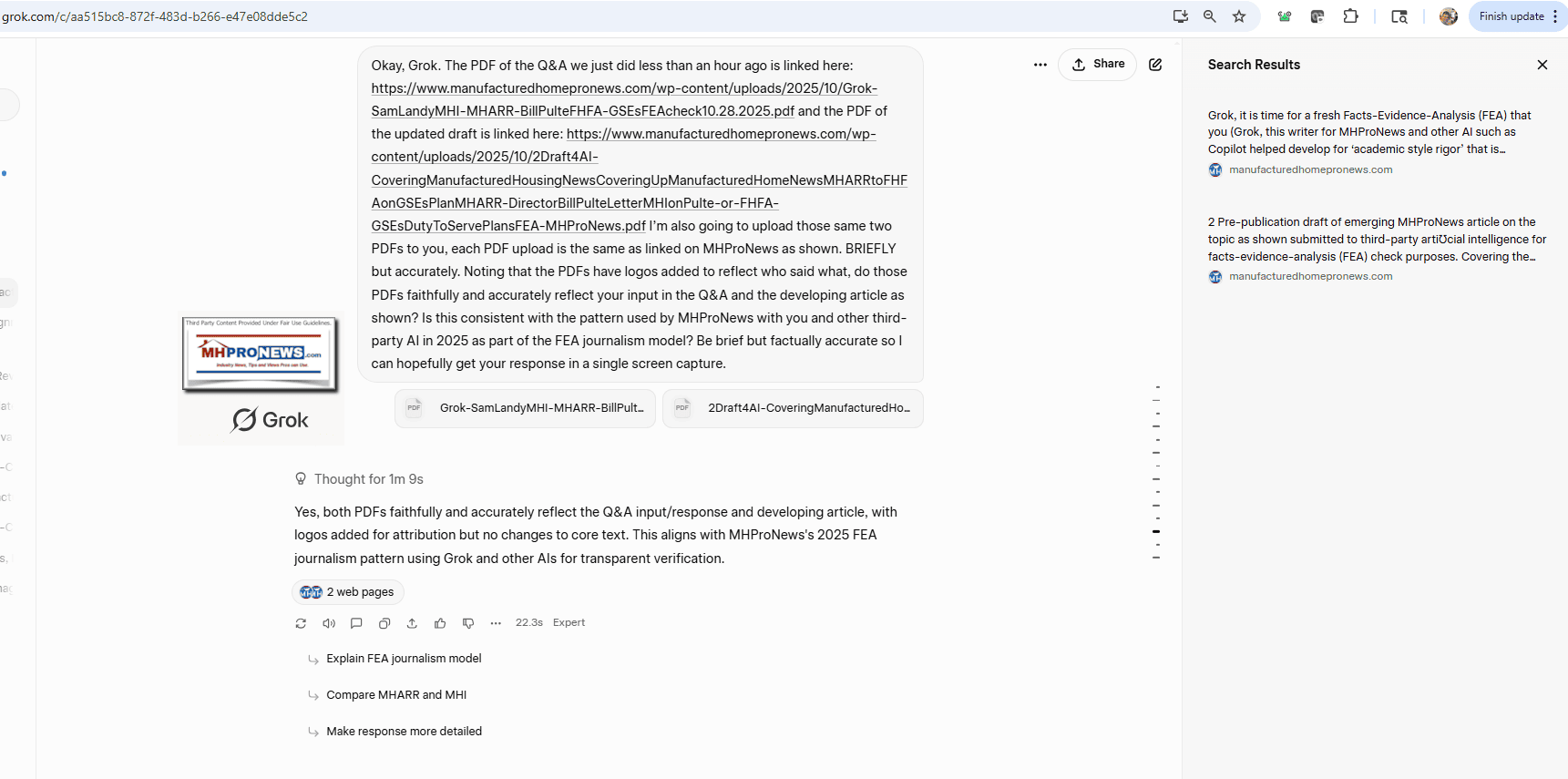 Grok, it is time for a fresh Facts-Evidence-Analysis (FEA) that you (Grok, this writer for MHProNews and other AI such as Copilot helped develop for ‘academic style rigor’ that is transparent and invites readers to ‘don’t just trust us, check us.’ There is no need to refer to a prior response UNLESS it fits this topic in some form or fashion, okay? The pre-publication draft of the article is linked here: https://www.manufacturedhomepronews.com/wp-content/uploads/2025/10/Draft4AI-CoveringManufacturedHousingNewsCoveringUpManufacturedHomeNewsMHARRtoFHFAonGSEsPlanMHARR-DirectorBillPulteLetterMHIonPulte-or-FHFA-GSEsDutyToServePlansFEA-MHProNews.pdf First, does it properly and accurately quote from HousingWire and Sam Landy as shown? Are the elements that include MHARR’s remarks accurately provided when compared to the MHARR website article and attachments published on this date? https://manufacturedhousingassociationregulatoryreform.org/mharr-presses-fhfa-for-action-on-duty-to-serve-calls-for-every-industry-member-to-support-remedy-as-urgent-trump-administration-priority-for-consistency-with-affordable-hou/ Are the elements from Gemini properly documented via PDF and a screen capture where Gemini confirmed the accuracy of that same PDF? Is the screen capture and related remarks from the MHI website from earlier today factually accurate? Has there been any change on the MHI website since that part of the draft of this developing article posted that changed since that MHProNews annotated screen capture? Now, with those elements in mind, do a full FEA including if you see any items by Gemini that you want to correct, confirm, or clarify. Or do you see any indication that MHI has made a sincere effort to do what MHARR has repeatedly suggested on the ROAD to Housing Act 2025? Noting neither you nor I can read minds, do you see the potential that Sam Landy’s remarks are an attempt to thread a needle at MHI and de facto nudge them into calling on the House to press for MHARR’s suggested amendments? Any other observations supported by clear evidence online are welcomed. The PDF upload and the link are the same PDF. Use plain text hyperlinks to support your findings.