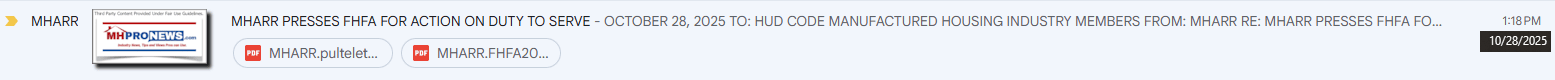 | MHARR Remarks/Attachments | Precisely Accurate | Oct 28 press release + Oct 21 letters to FHFA/Pulte verbatim: Urges Nov 5 comments; blasts 17+ yr DTS failure (esp. ~80% chattel); Trump priority. MHARR Site |