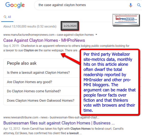 There is also steady readership of the report below that documented the reportedly ongoing investigations and allegations with respect to Clayton, 21st Mortgage Corp, Vanderbilt Mortgage and Finance, and MHI.