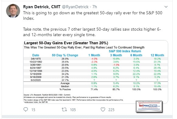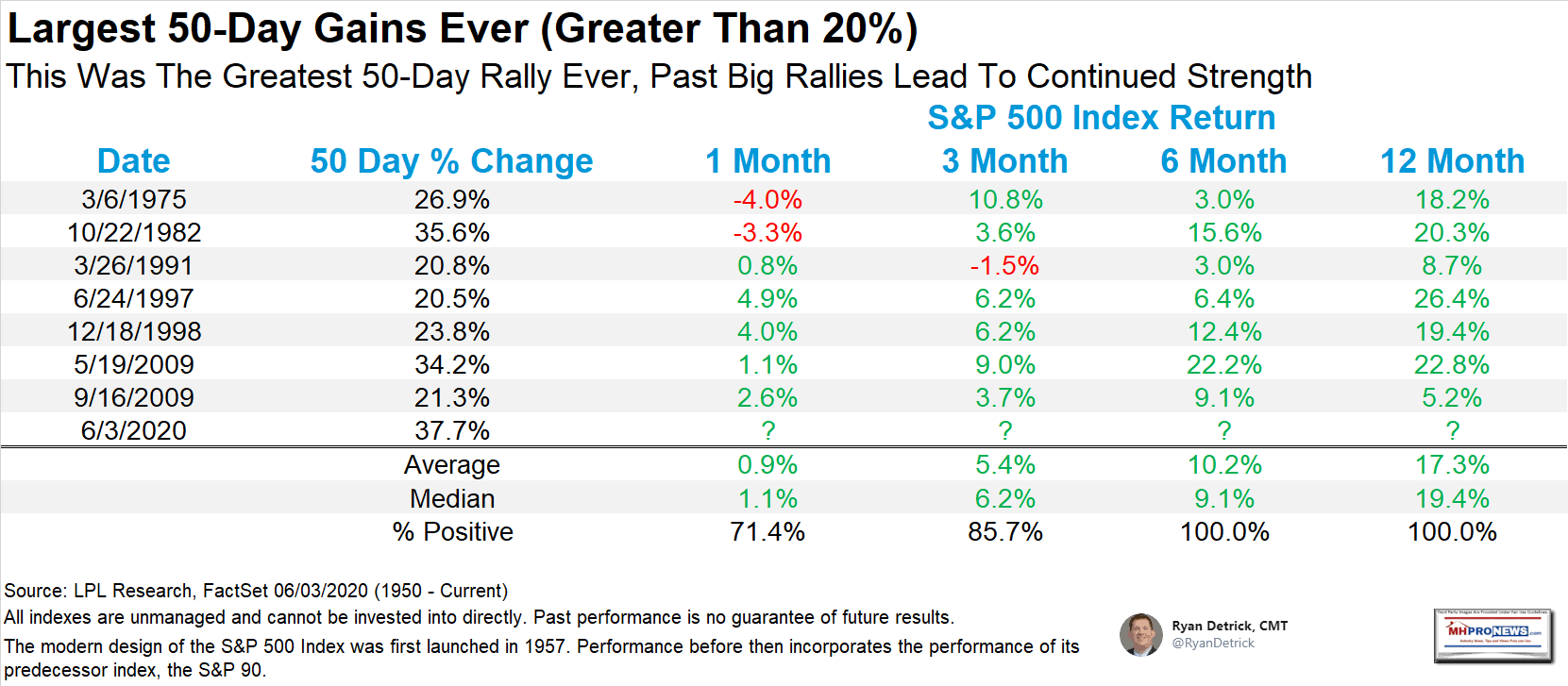 - The S&P 500 has returned 37.7% over the last 50 trading days, making it the benchmark index’s largest 50-day rally in history, according to LPL Financial.