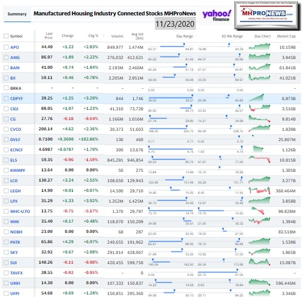 Manufactured Housing Industry Investments Connected Closing Equities Tickers